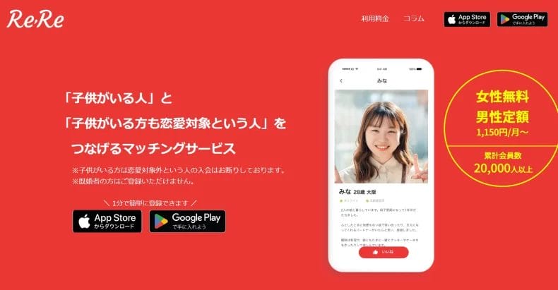ReRe![]() | 子供がいる人のためのマッチングアプリ 無料ダウンロード | 2,900円 | 無料 | 20~30代 | 2万人 | 〇 | ✕ | ✕ | 〇 | 〇 |