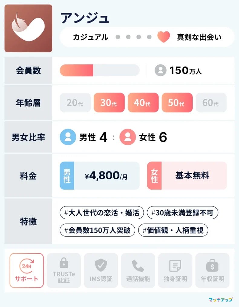 アンジュ![]() | 30歳以上限定の落ち着いた大人の出会いに特化 無料ダウンロード | 4,800円 | 無料 | 30~50代 | 150万人 | 〇 | 〇 | ✕ | 〇 | 〇 |