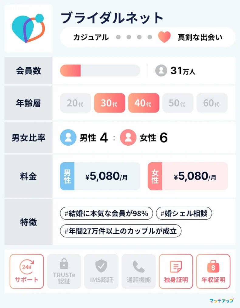 ブライダルネット![]() | 婚活のプロのサポートも受けられる 無料ダウンロード | 5,080円 | 5,080円 | 30~40代 | 31万人 | 〇 | 〇 | 〇 | 〇 | 〇 |