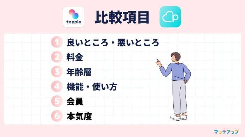 ここでは、「良いところ・悪いところ」「料金」「年齢層」「機能・使い方」「会員」「本気度」という6つの重要な項目で両アプリを徹底比較し、あなたがどちらを選ぶべきかの最終結論を導き出します。