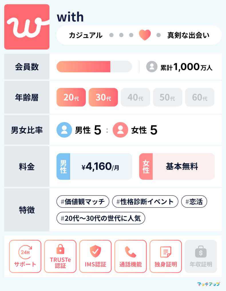 withは独自の性格・相性診断があり、メッセージの話題には困りません。